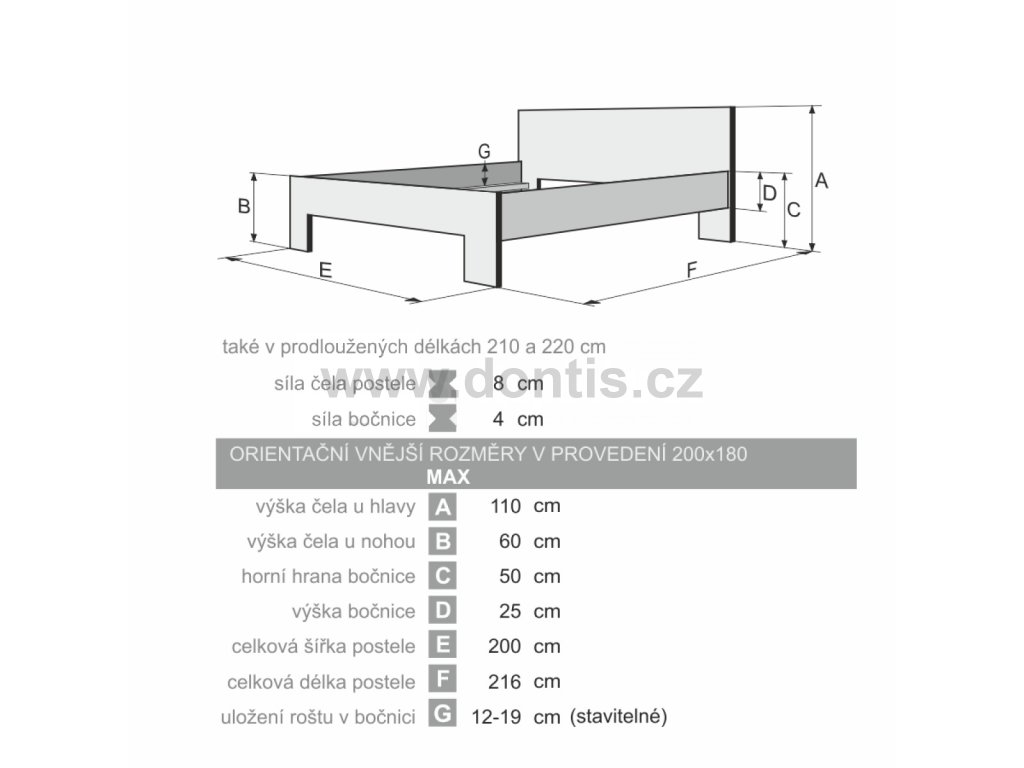 - Možnost dodání prodloužené varianty 210 cm (příplatek +5%) nebo 220 cm (příplatek +10%).